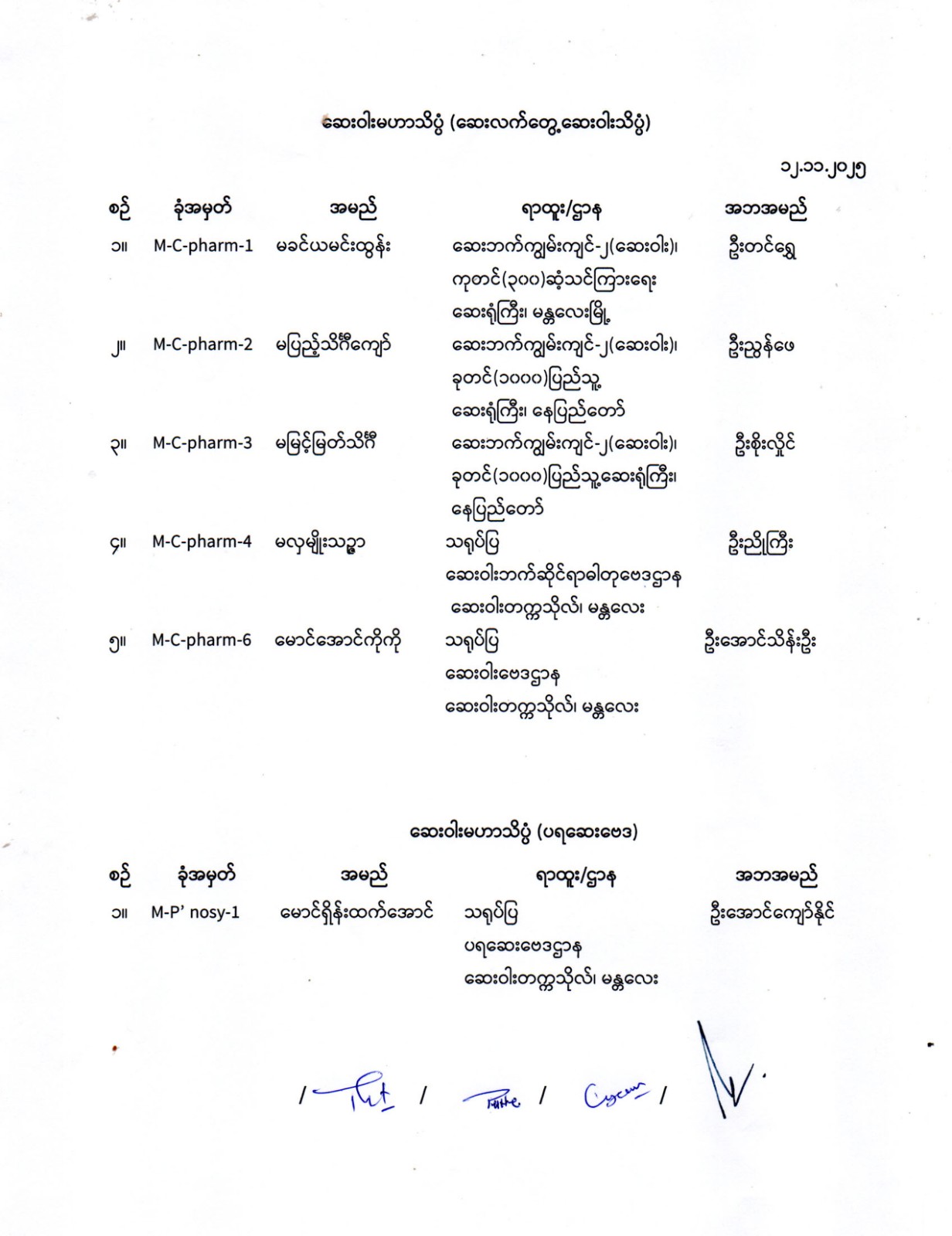 ဆေးဝါးမဟာဘွဲ့လွန်သင်တန်းများ ဝင်ခွင့် အရည်အချင်းစစ် စာမေးပွဲအောင်မြင်သူများစာရင်း